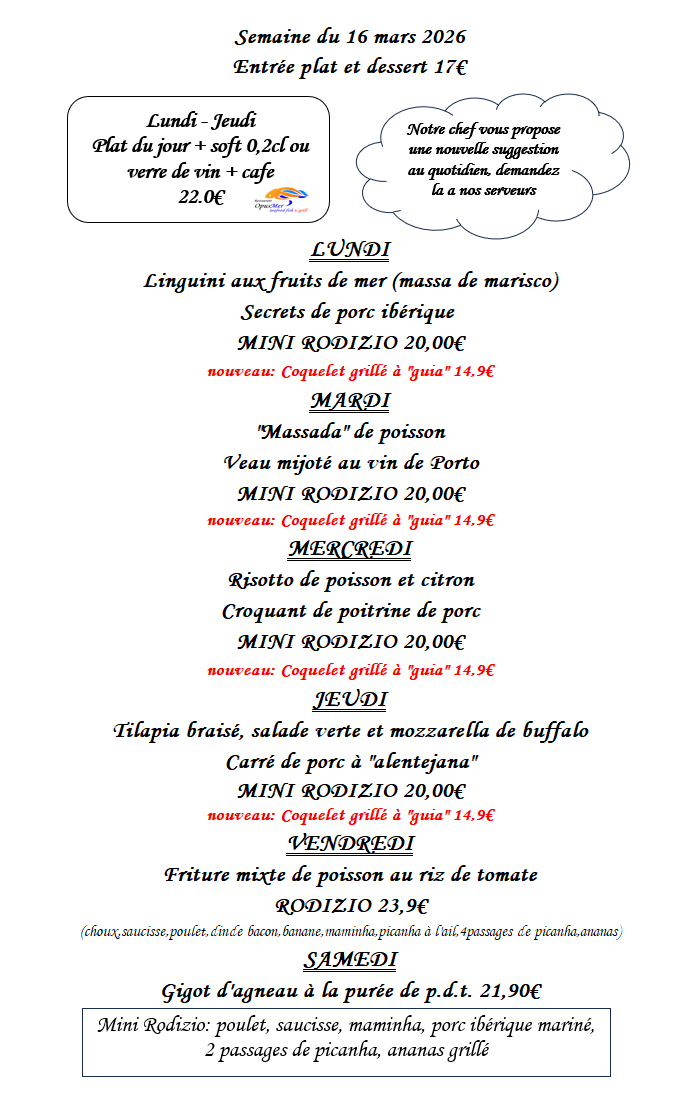 Notre restaurant est spécialisé dans les fruits de mer de qualité ainsi que dans la célÚbre Picanha du Brésil, servie directement à table. La viande est découpée devant vous et servie selon vos préférences : assaisonnement, point de cuisson et découpe, pour une expérience gastronomique personnalisée.